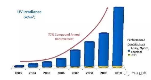 uvled光固化機的輸出功率在最近幾年得到了相當大的提高,從若干家供應商所提供的產(chǎn)品指標數(shù)據(jù)可以看出,從2005年到2011年輸出功率的復合年均增長率在5%到10%之間。但對于LED整體表現(xiàn)的評估,另外三個因素對于增加LED的效能更加重要:陣列、冷卻和光學系統(tǒng)。