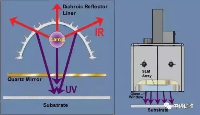 基于最終的應用需求,光學工程師必須決定應該采用何種形狀、形式以及材質來最好地利用LED的獨特性能,然后還需要注意LED是一種泛光形式的光,而不像汞燈模式中紫外光被反射罩反射并指向特定的點并具有一定的聚焦長度。下圖標出了傳統(tǒng)汞燈和UV LED燈在這一點上面的不同。