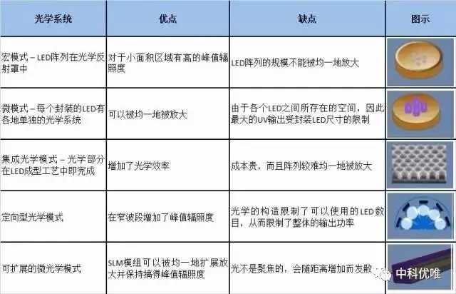 UV LED光源的效能。對于UV LED供應商所采用的幾種典型光學方法及其優(yōu)缺點的匯總見下表。